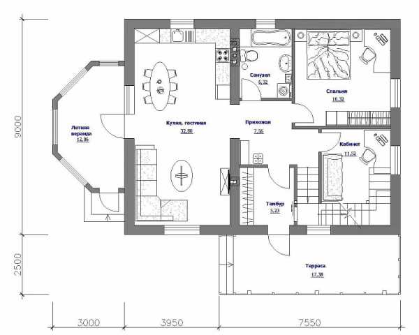 В доме предусмотрен холодный тамбур, что для наших широт очень важно и необходимо. Прихожая с тамбуром образуют центральную входную зону, которая открыта для входа во все помещения первого этажа, а также через входную зону обеспечен быстрый доступ посредством удобной трехмаршевой лестницы ко всем помещениям второго этажа. Совмещенный санузел первого этажа расположен близко к центру дома. Водонесущие коммуникации санузлов и кухни выполнены компактно. При проживании большой семьи санузел первого этажа возможно разделить на туалет и ванную комнату.